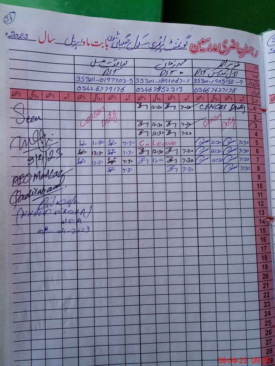 | CNIC | Full Name | Designation | R/C | Absence During Last Calender Month |