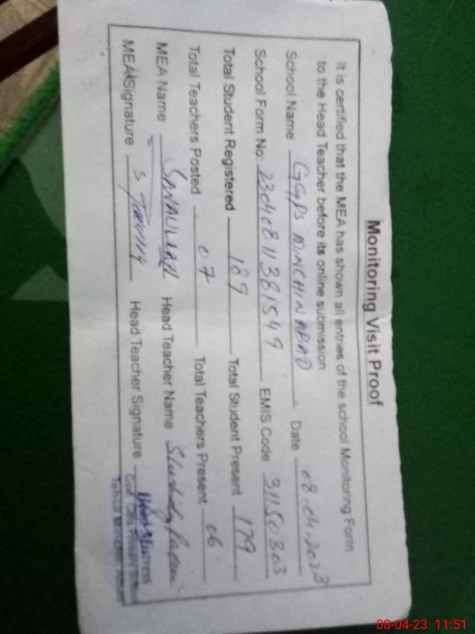 | Attendance Register | Head Teacher | MEA with School | Visit Proof |