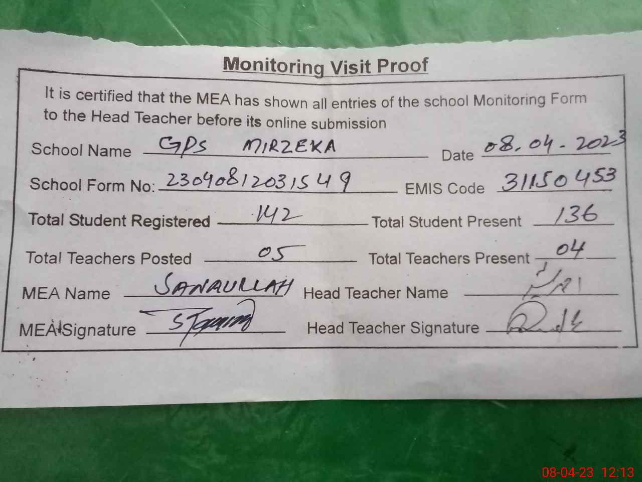| EMIS Code: 31150453 | Name of School: GPS MIRZEKA | |||