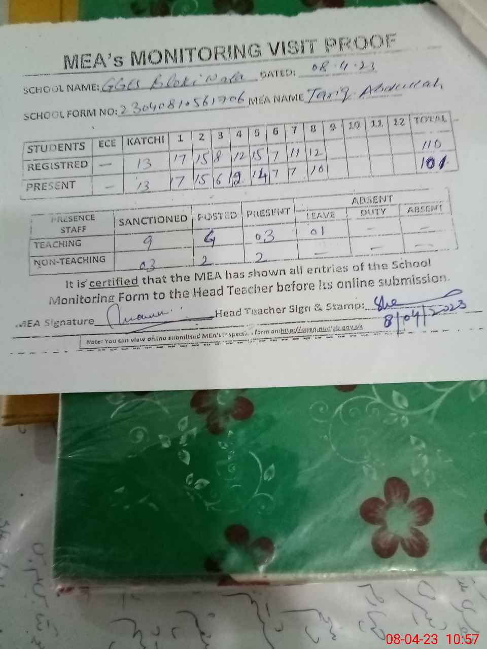 | Attendance Register | Head Teacher | MEA with School | Visit Proof |