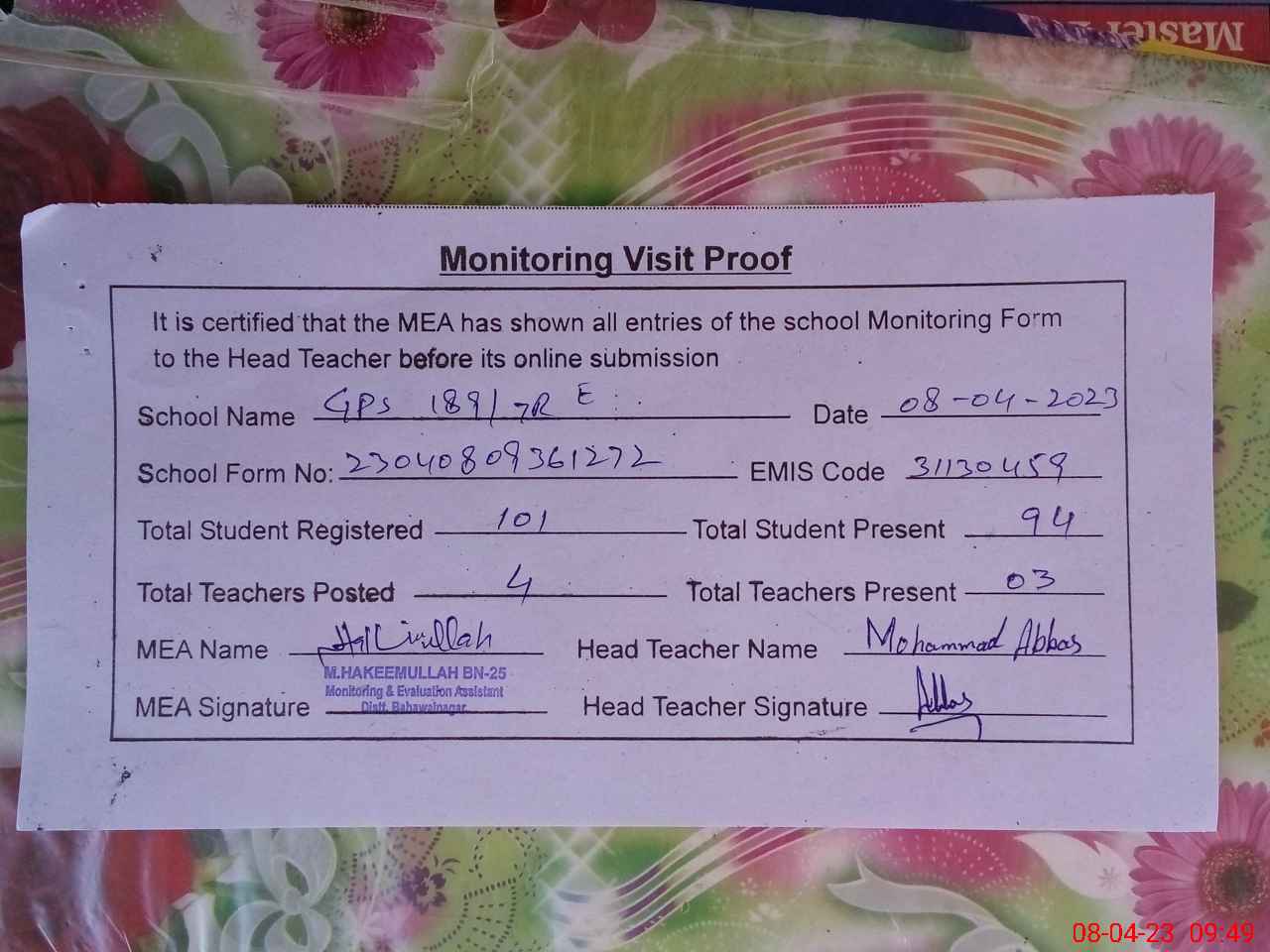 | Attendance Register | Head Teacher | MEA with School | Visit Proof |