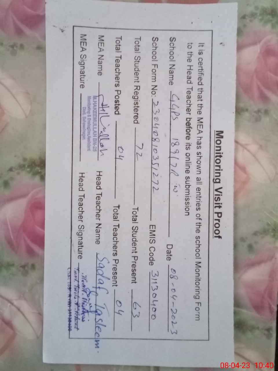 | Attendance Register | Head Teacher | MEA with School | Visit Proof |