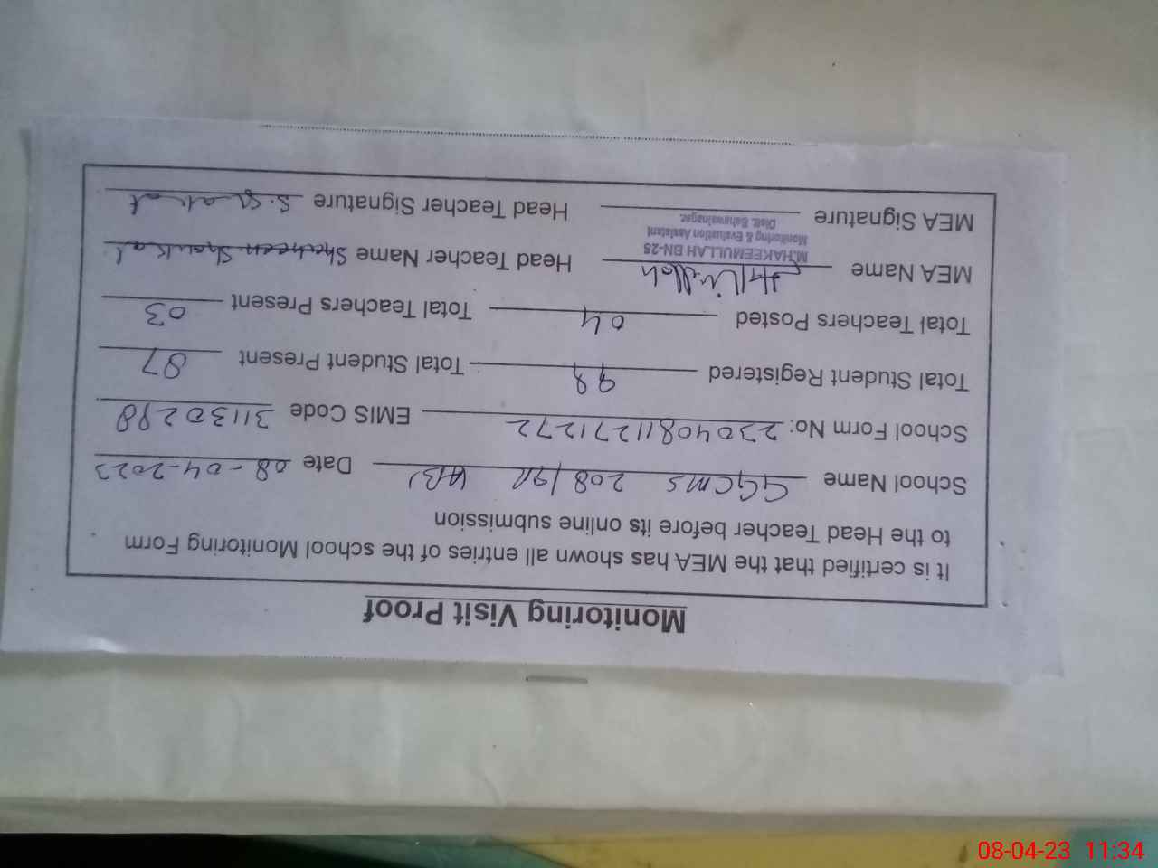 | Attendance Register | Head Teacher | MEA with School | Visit Proof |