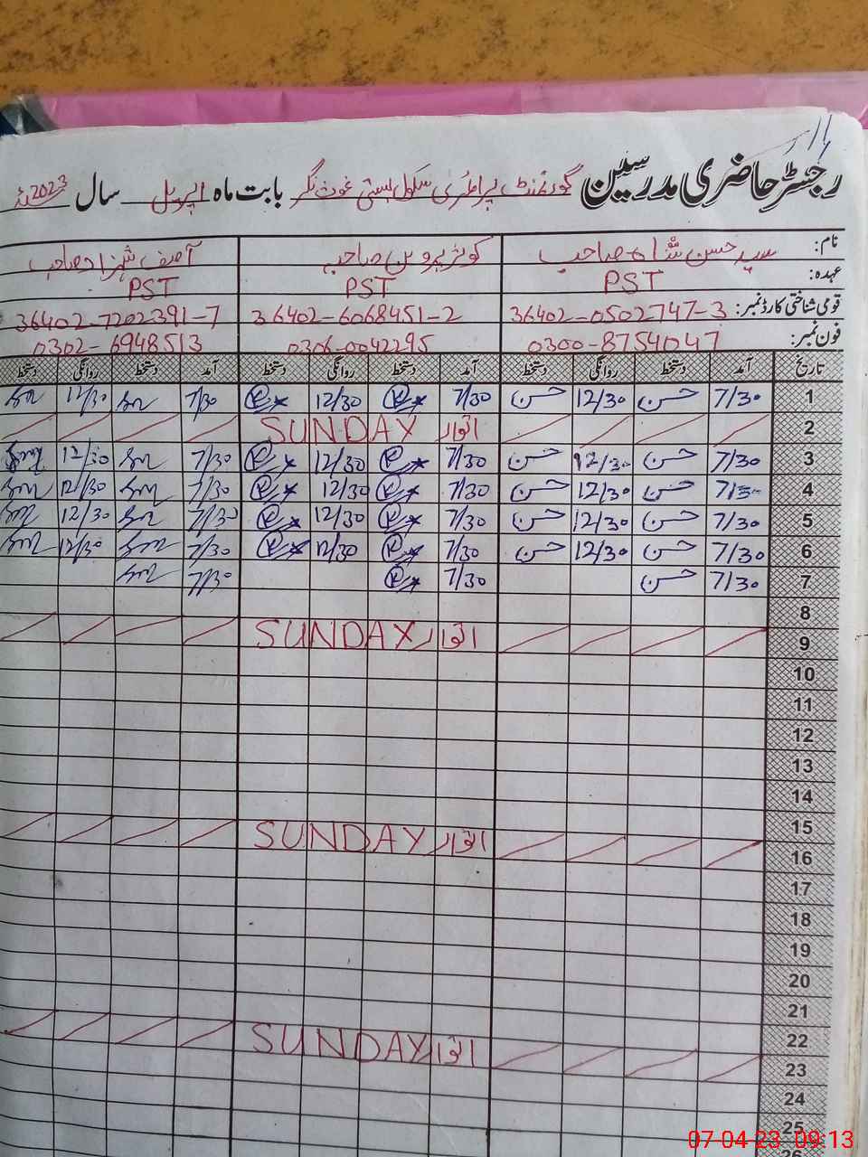 | Name: SY**** HA**** SH**** Designation: (School Headmaster's/Headmistress's) PST Phone/Cell Number: 03**** |