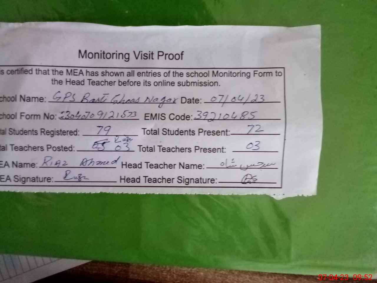 | Attendance Register | Head Teacher | MEA with School | Visit Proof |