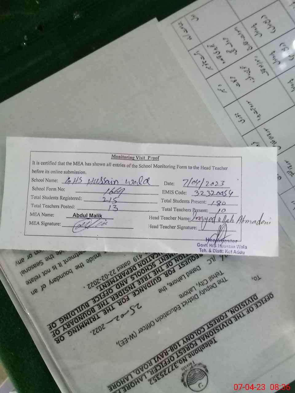 | EMIS Code: 32320054 | Name of School: GHS HUSSAIN WALA | |||