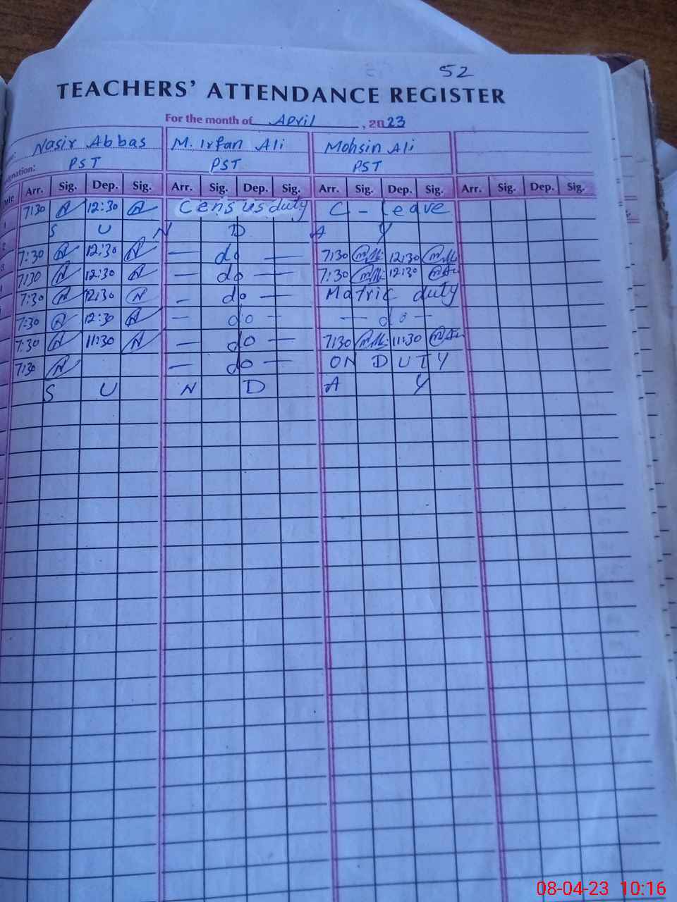 | 33**** | Mo**** Al**** | PST | Regular | 2 | 0 | 0 | 0 | 0 | 0 | 0 | 0 | 2 | Exam Duty |