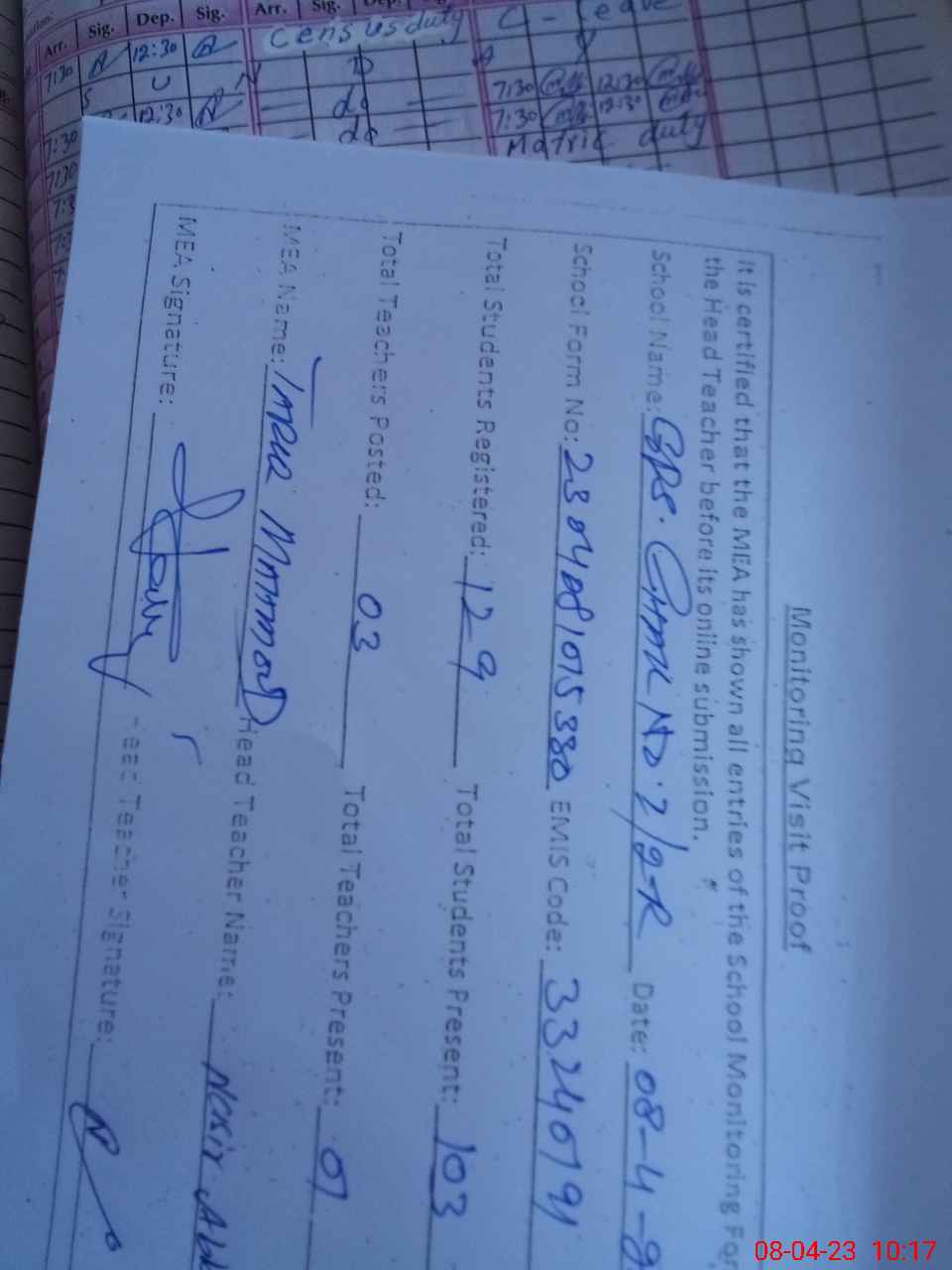| Attendance Register | Head Teacher | MEA with School | Visit Proof |