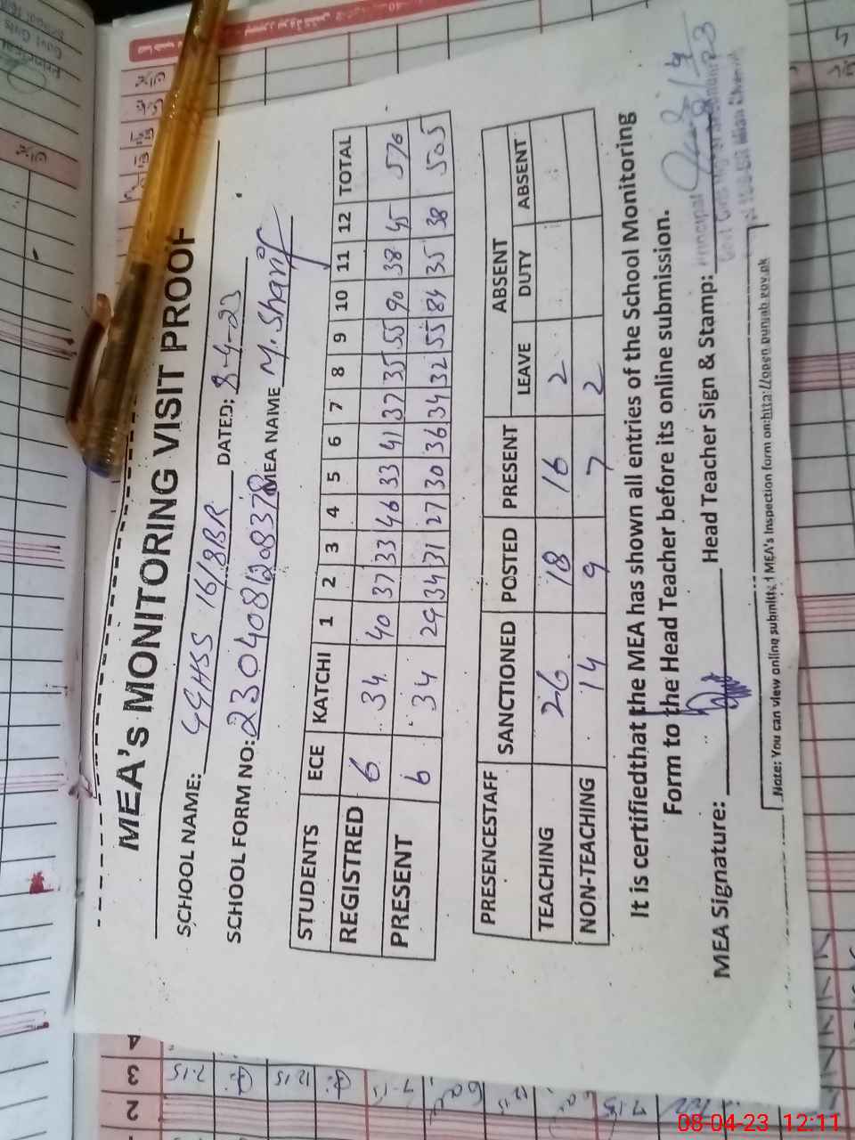 | Attendance Register | Head Teacher | MEA with School | Visit Proof |
