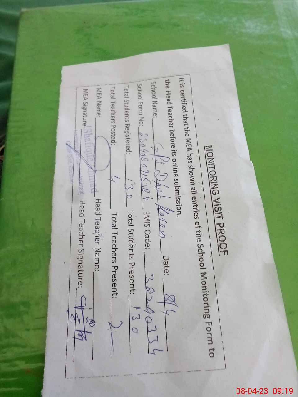 | Attendance Register | Head Teacher | MEA with School | Visit Proof |