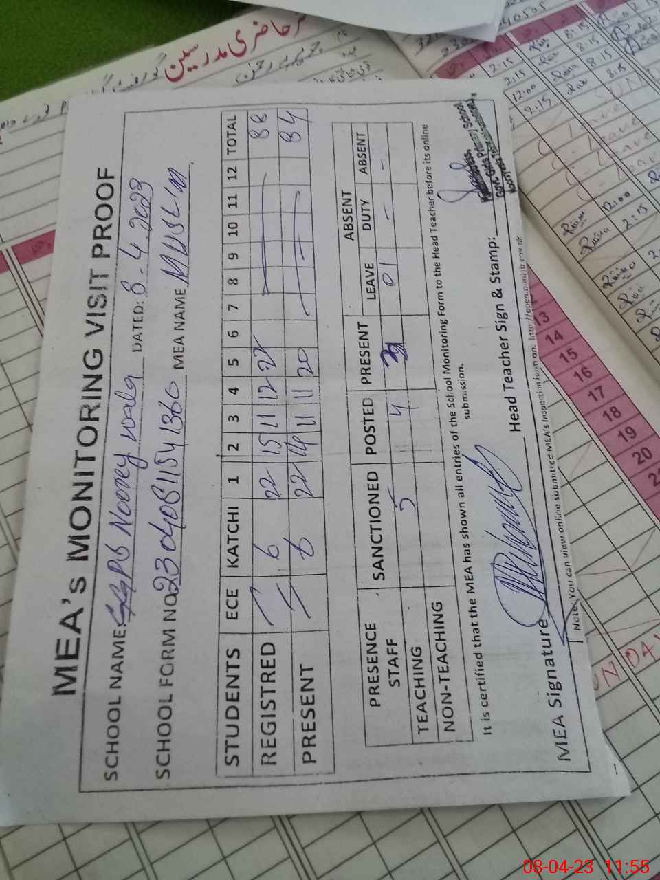 | Attendance Register | Head Teacher | MEA with School | Visit Proof |