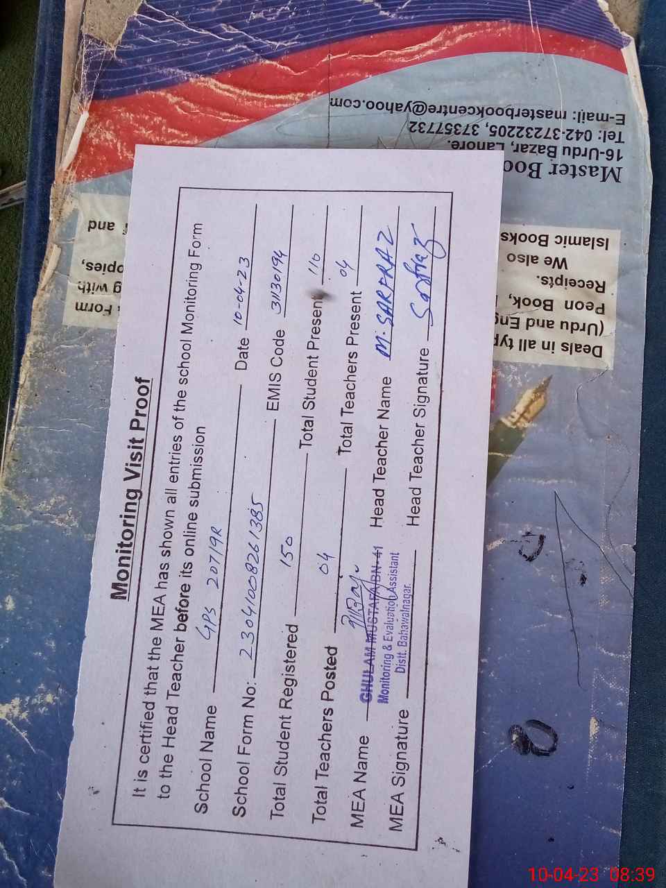 | Attendance Register | Head Teacher | MEA with School | Visit Proof |