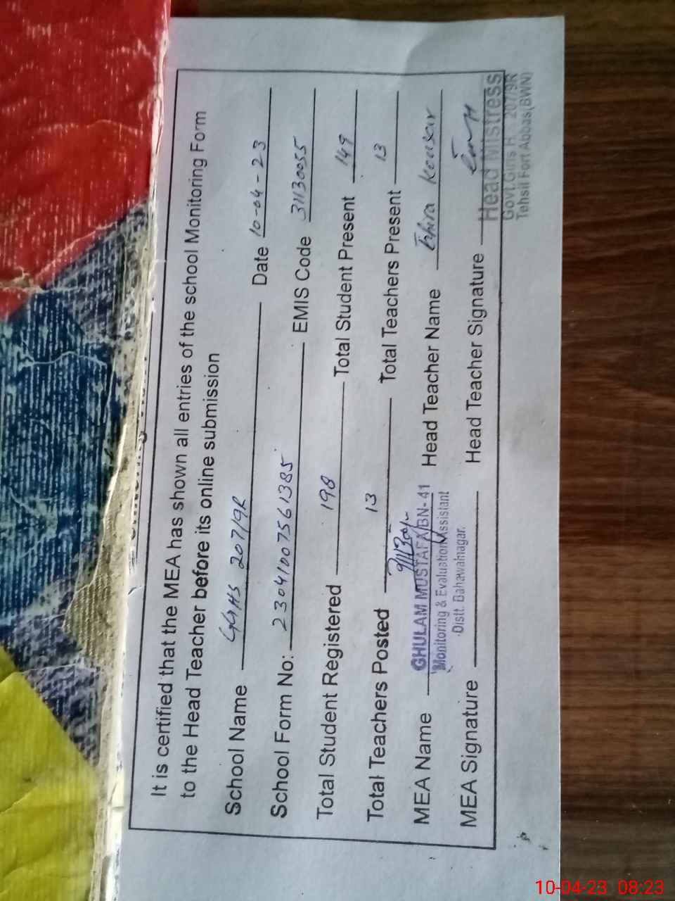 | Attendance Register | Head Teacher | MEA with School | Visit Proof |