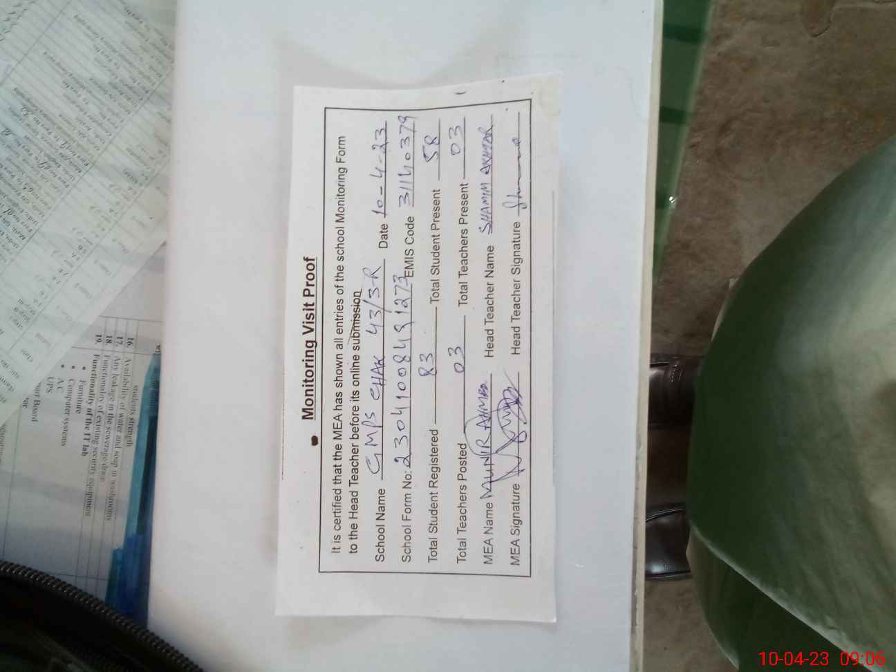 | Attendance Register | Head Teacher | MEA with School | Visit Proof |