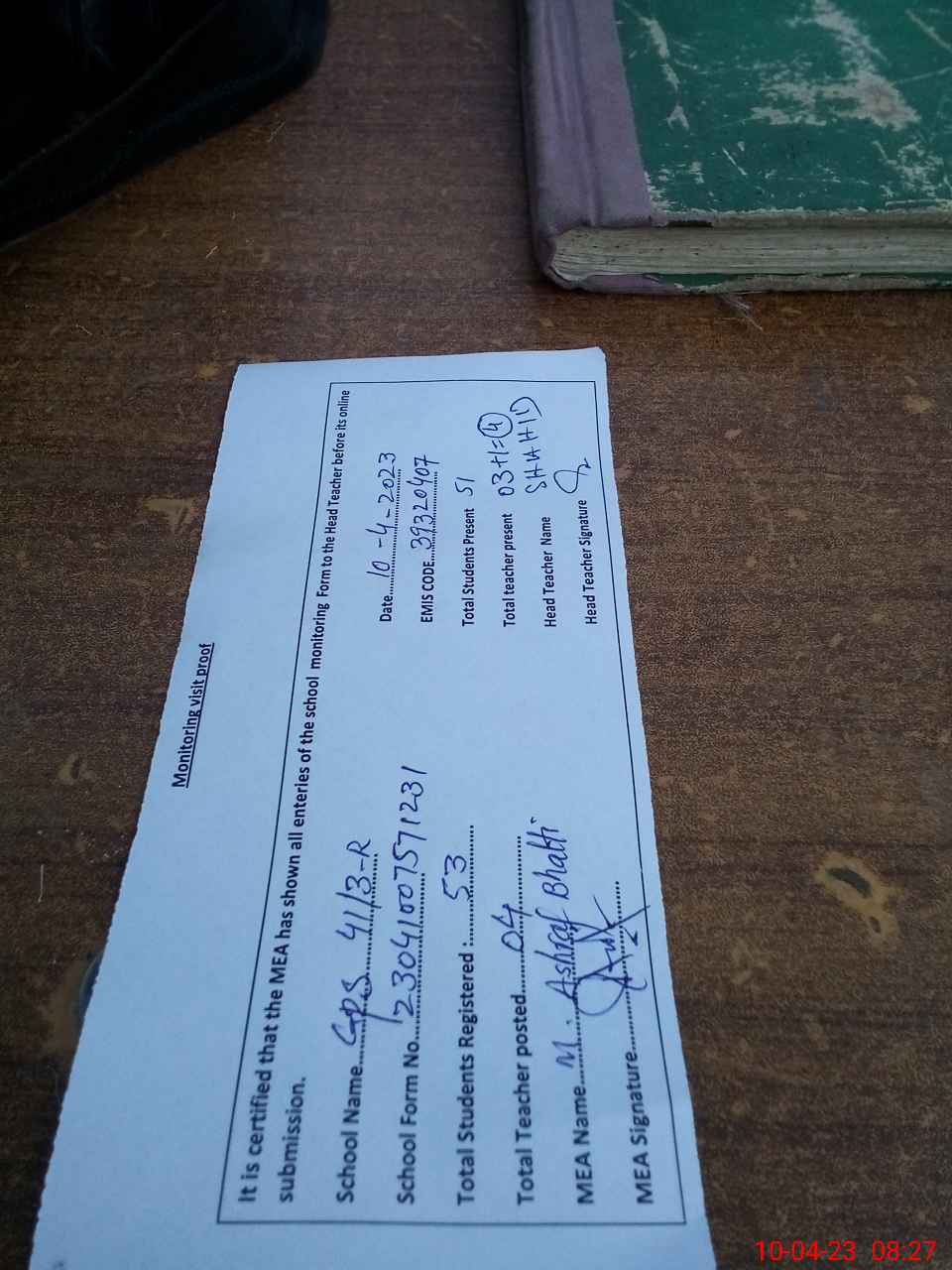 | Attendance Register | Head Teacher | MEA with School | Visit Proof |