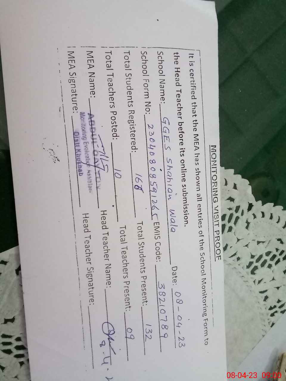 | Attendance Register | Head Teacher | MEA with School | Visit Proof |