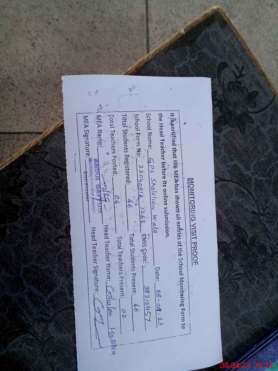 | Attendance Register | Head Teacher | MEA with School | Visit Proof |