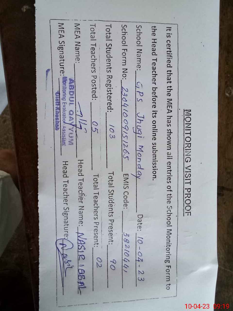 | Attendance Register | Head Teacher | MEA with School | Visit Proof |
