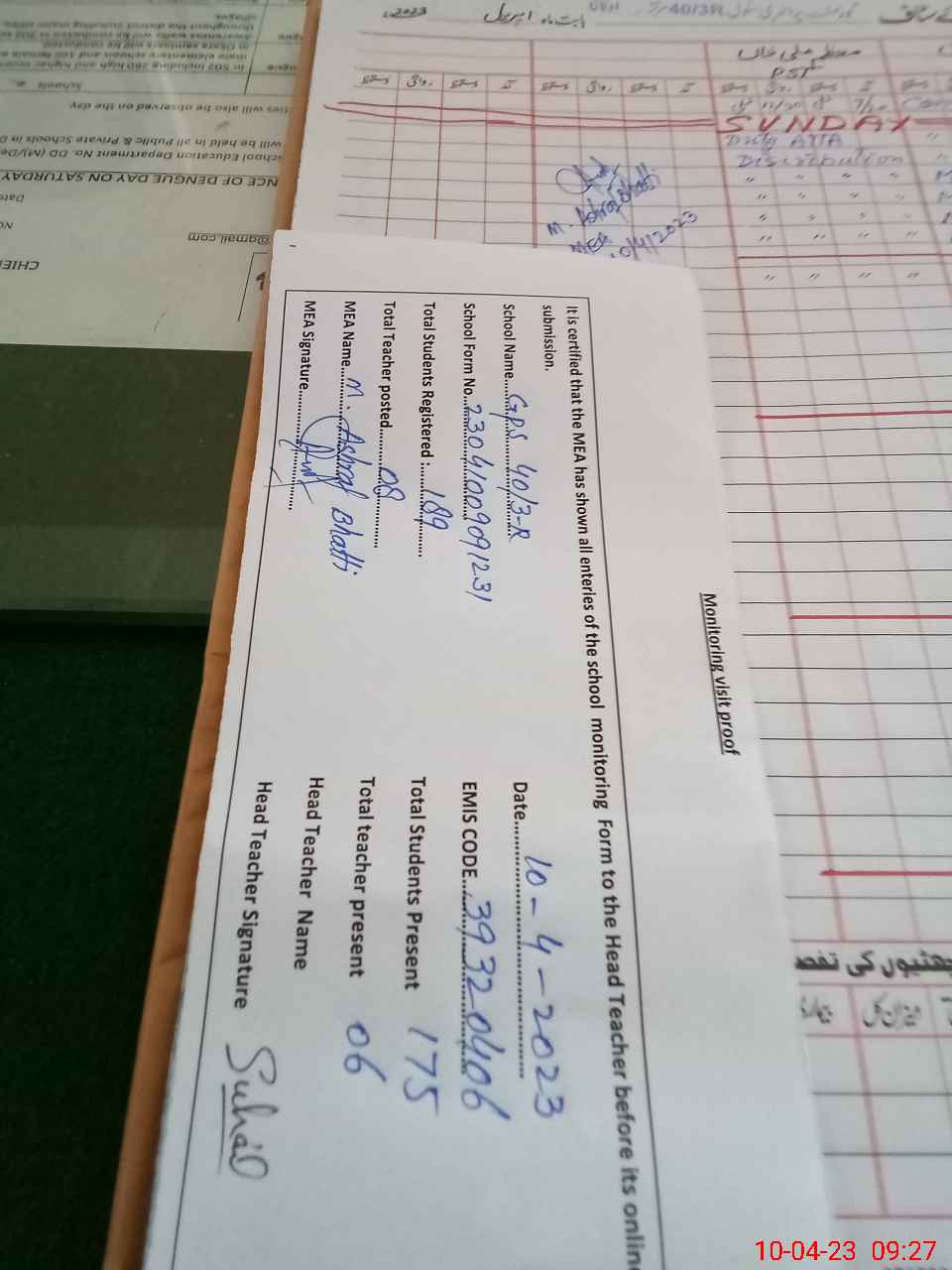 | Attendance Register | Head Teacher | MEA with School | Visit Proof |