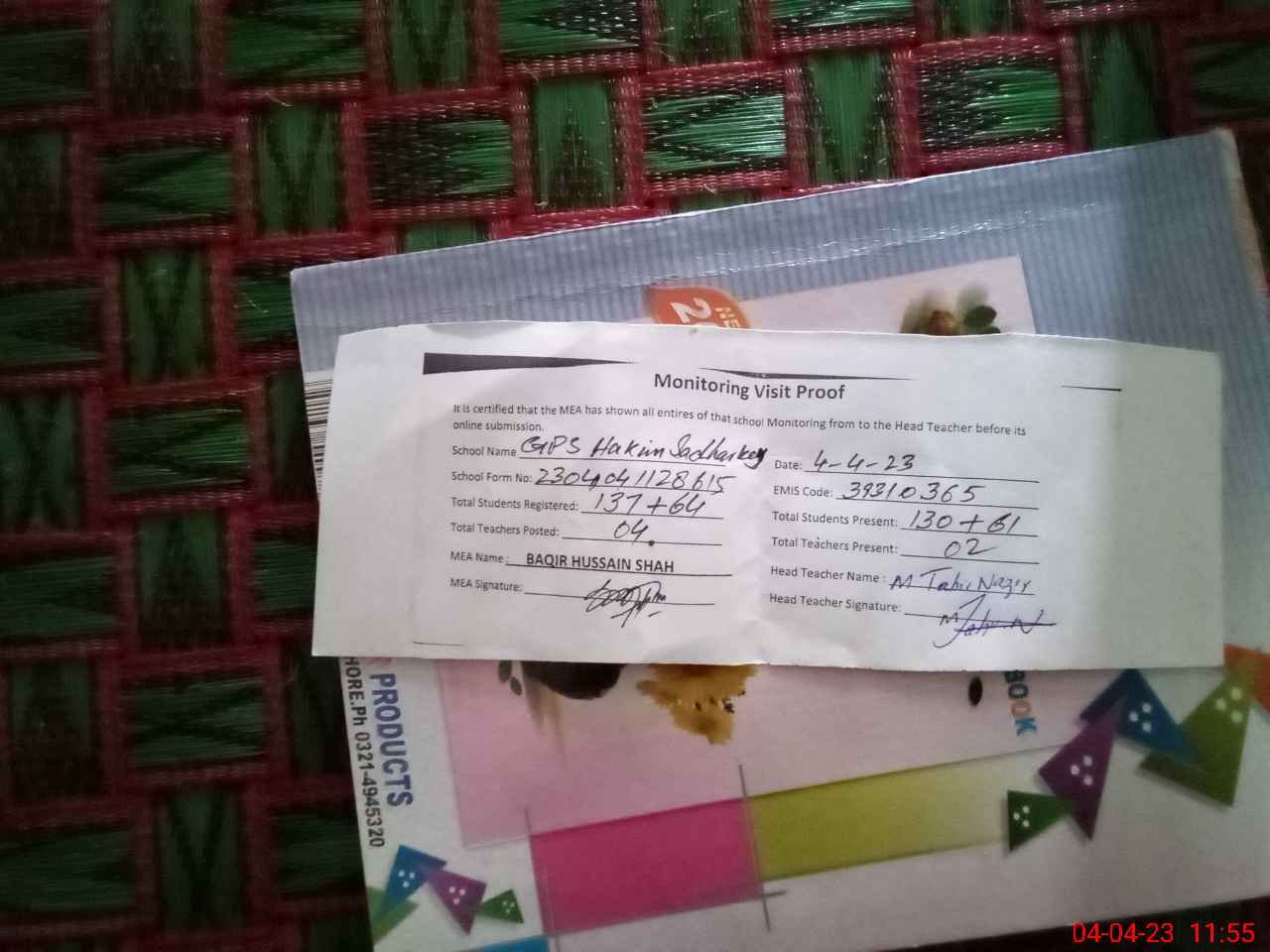 | Attendance Register | Head Teacher | MEA with School | Visit Proof |