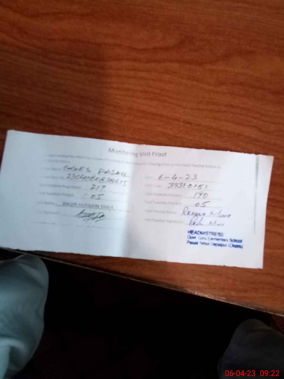| Attendance Register | Head Teacher | MEA with School | Visit Proof |