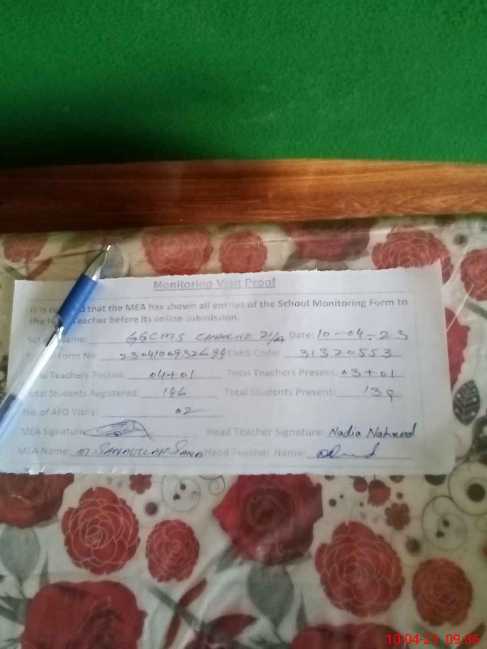 | Attendance Register | Head Teacher | MEA with School | Visit Proof |