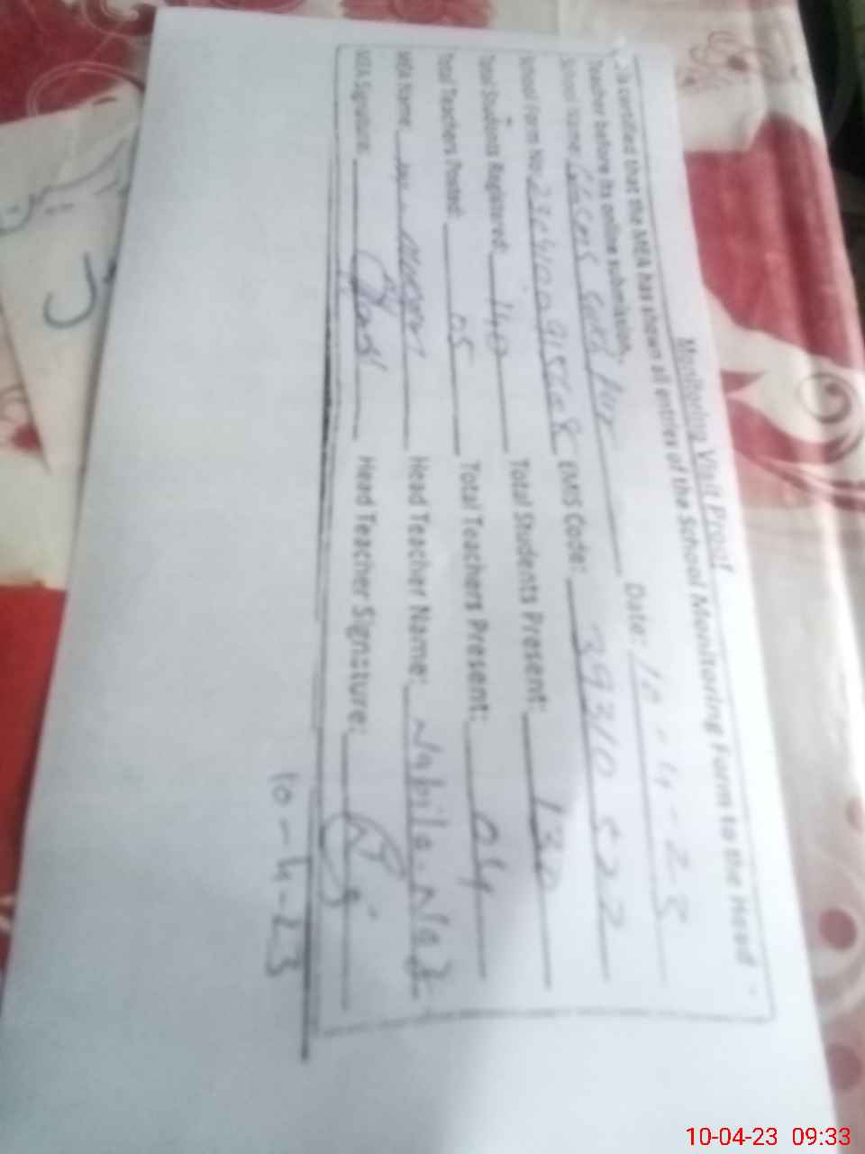 | Attendance Register | Head Teacher | MEA with School | Visit Proof |