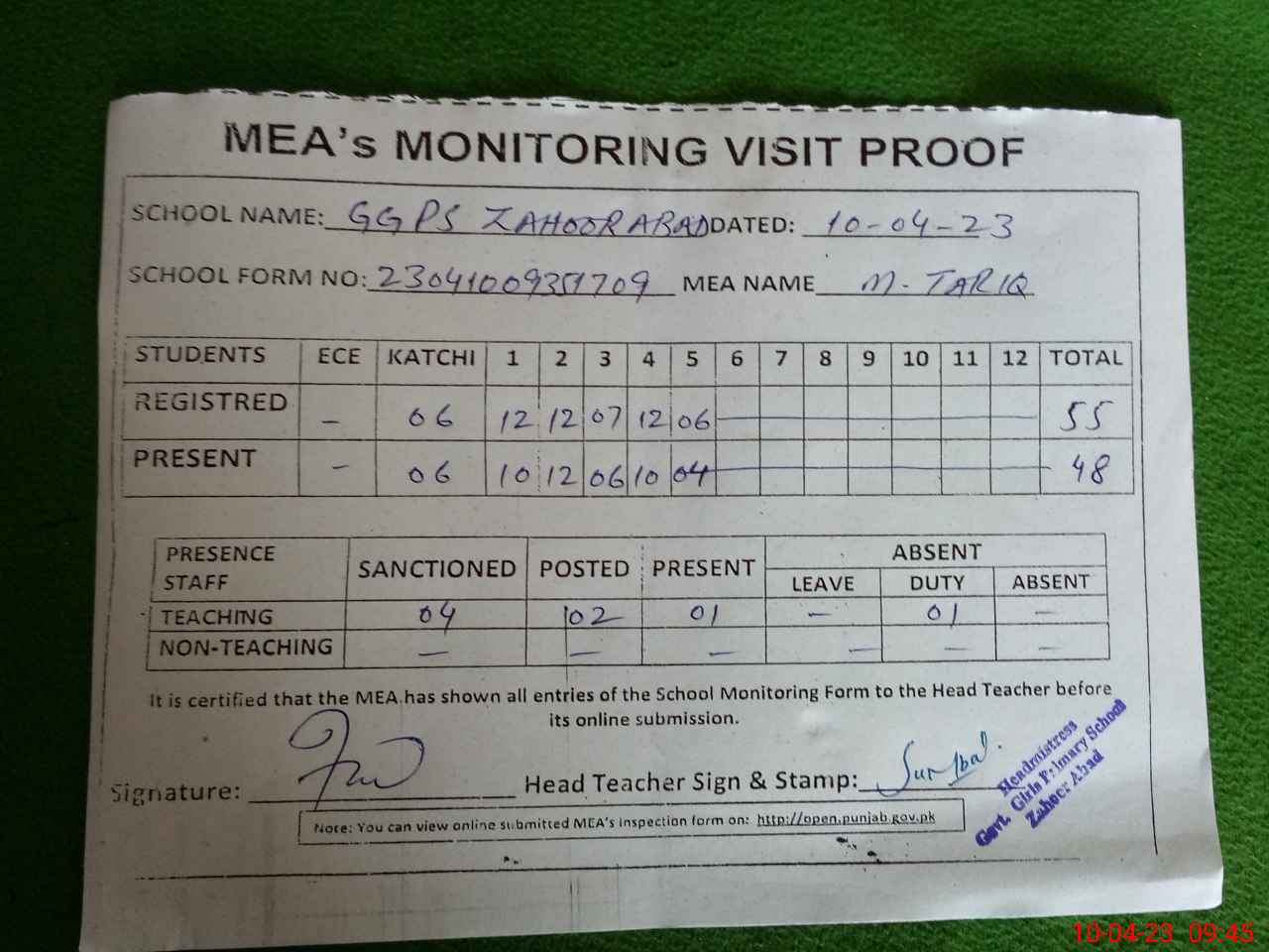 | Attendance Register | Head Teacher | MEA with School | Visit Proof |