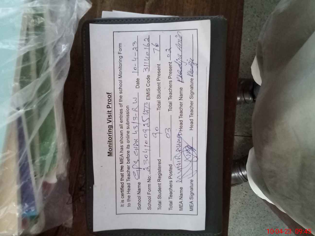 | Attendance Register | Head Teacher | MEA with School | Visit Proof |