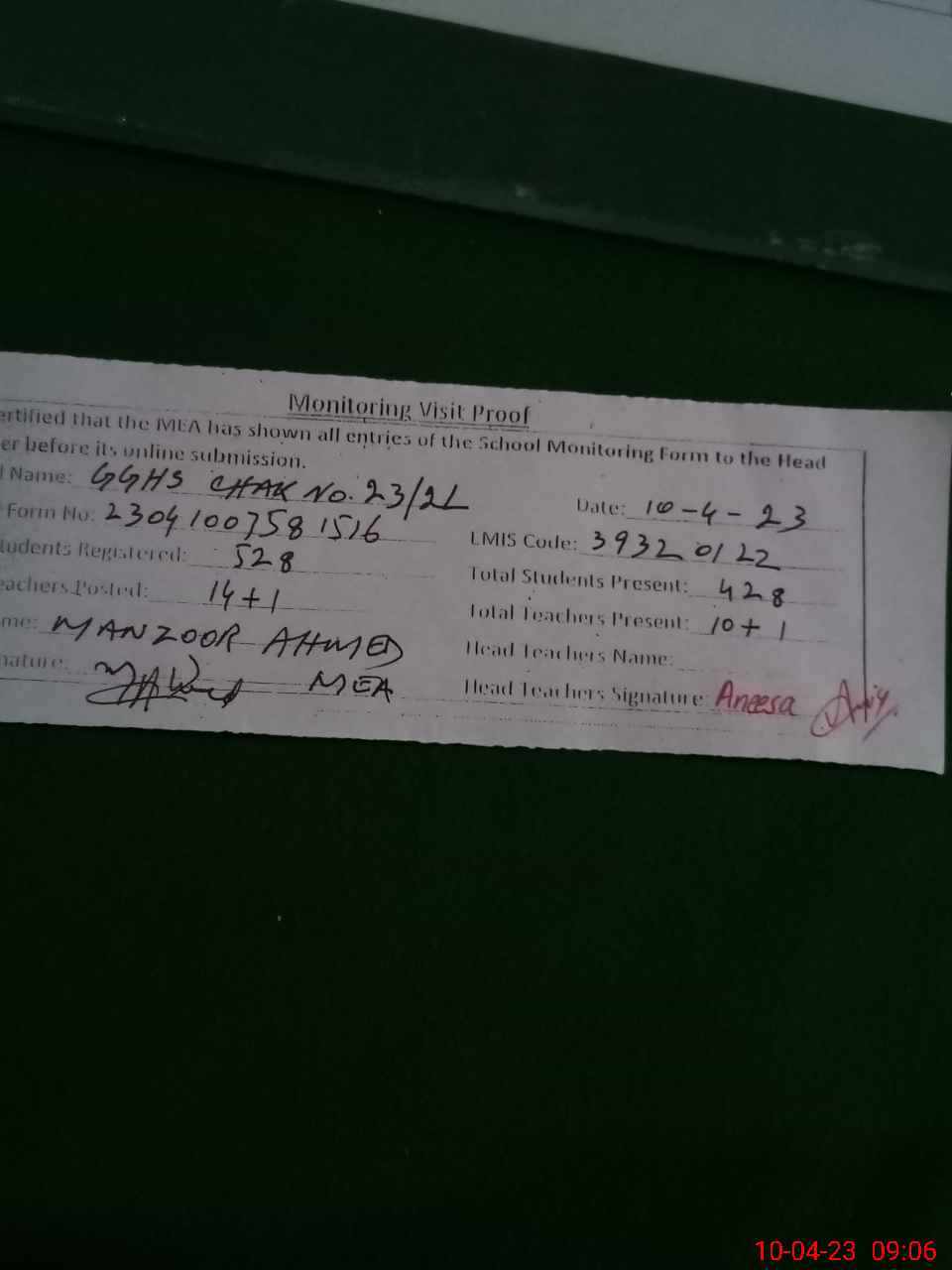 | Attendance Register | Head Teacher | MEA with School | Visit Proof |