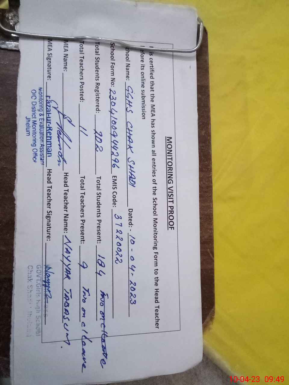 | EMIS Code: 37220022 | Name of School: GGHS CHAK SHADI | |||