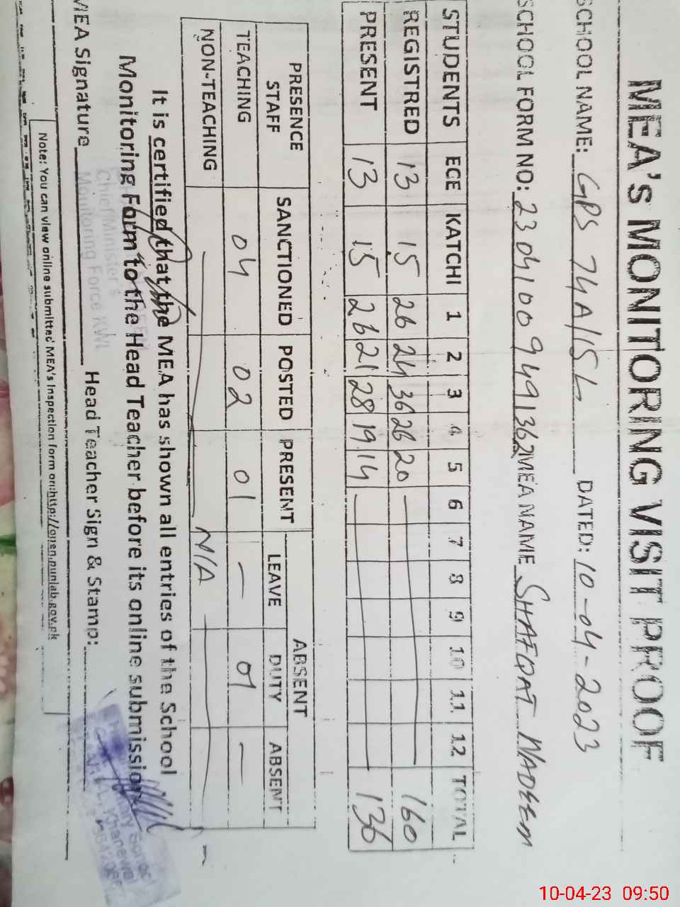 | Attendance Register | Head Teacher | MEA with School | Visit Proof |