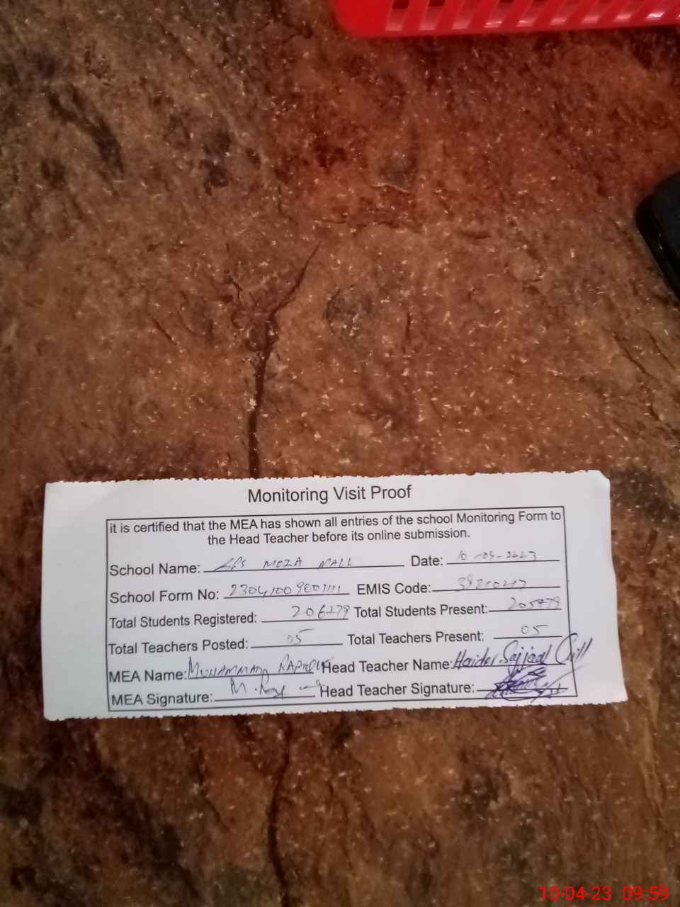 | Attendance Register | Head Teacher | MEA with School | Visit Proof |