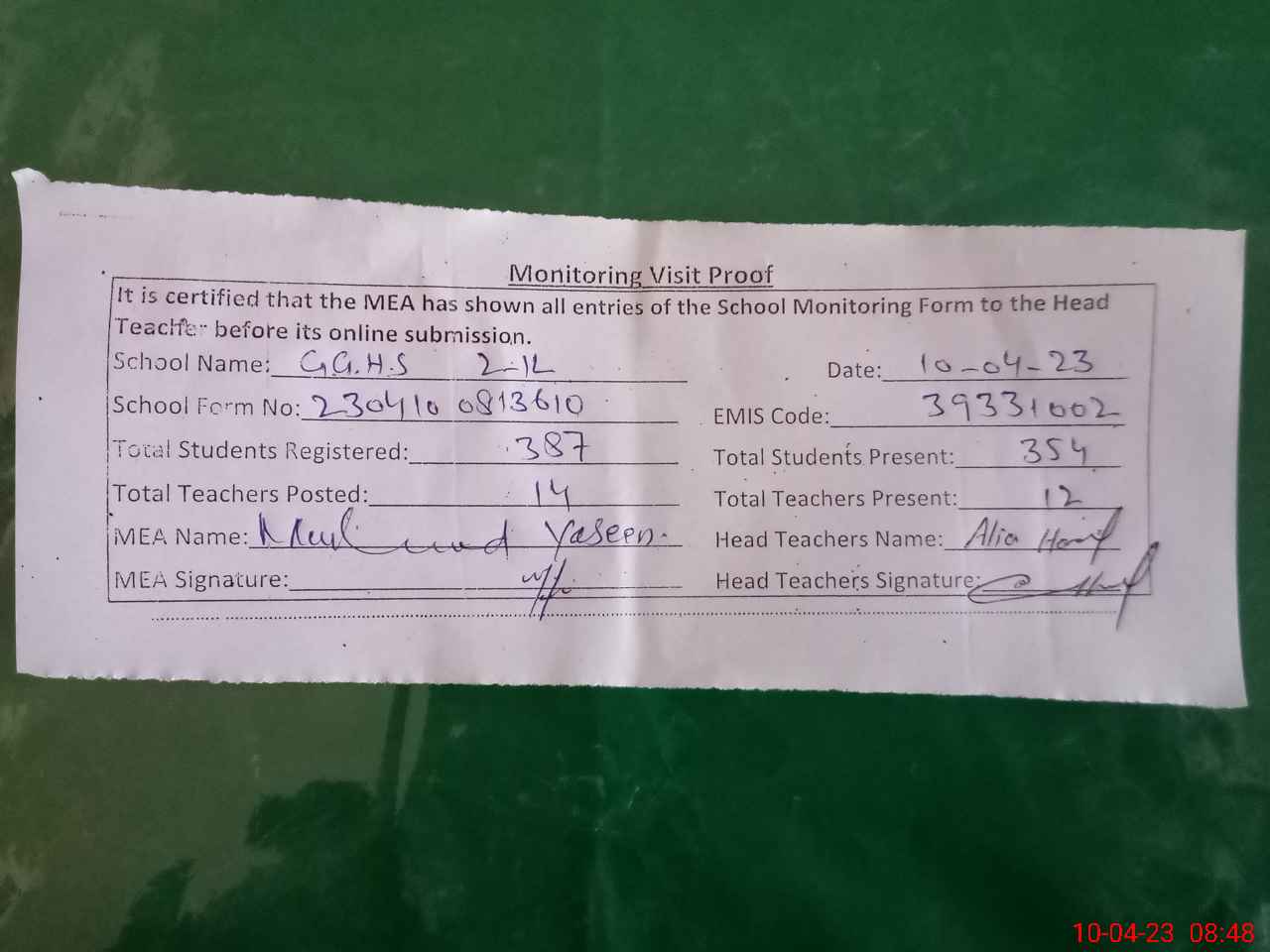 | Attendance Register | Head Teacher | MEA with School | Visit Proof |