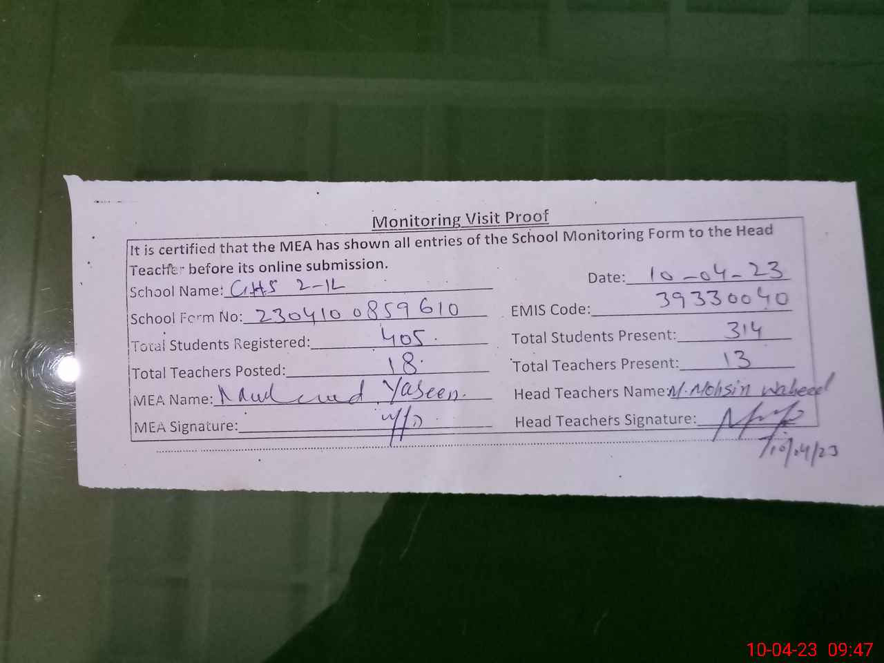 | Monitoring Date: 10-04-2023 | Start Time: 10-04-2023 08:59 AM | End Time: 10-04-2023 09:49 AM | Name of MEA: MU**** YA**** | |