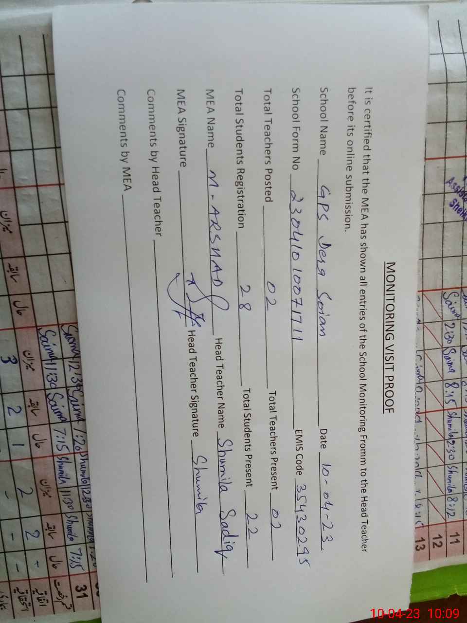 | Attendance Register | Head Teacher | MEA with School | Visit Proof |