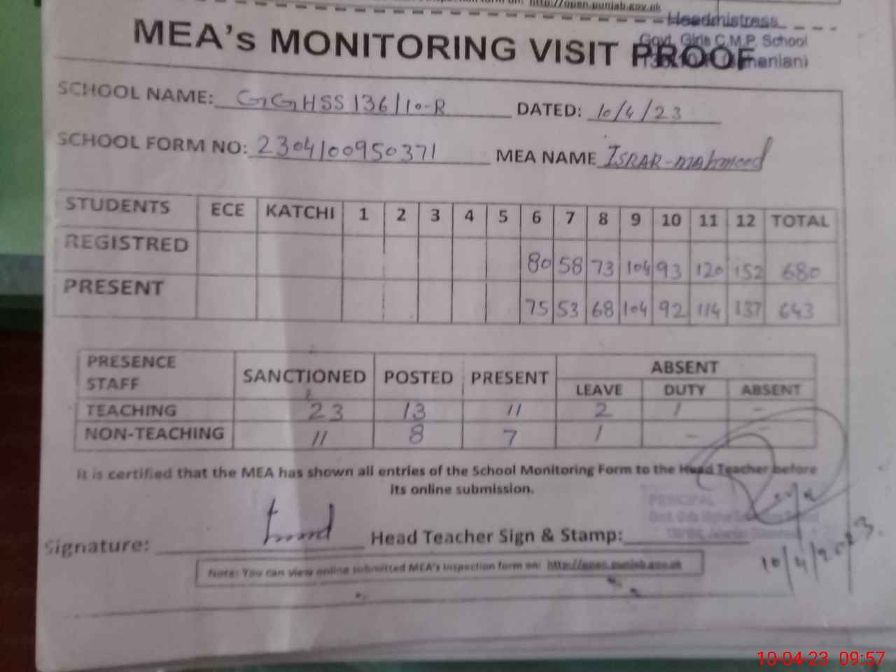 | Attendance Register | Head Teacher | MEA with School | Visit Proof |