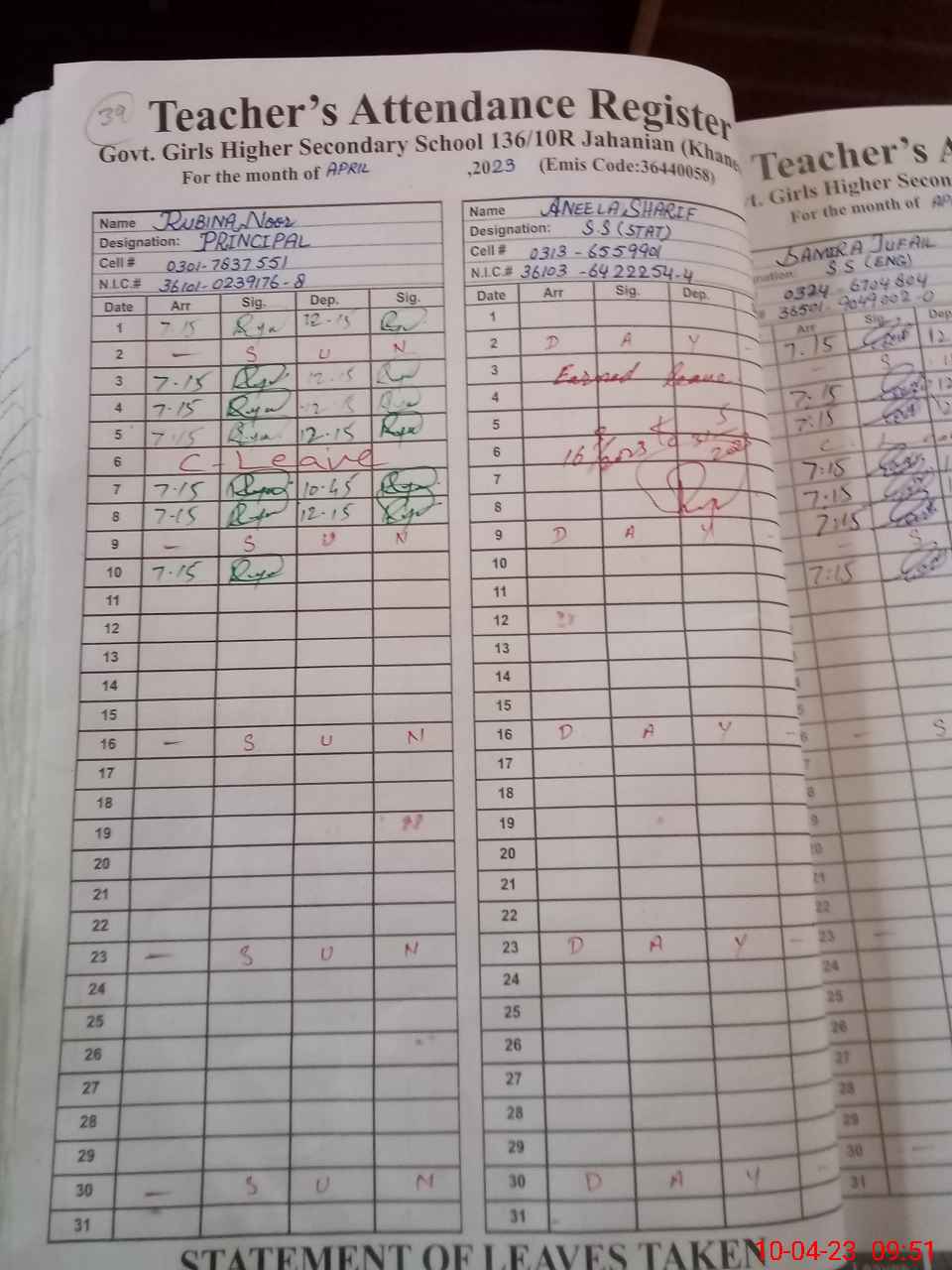 | CNIC | Full Name | Designation | R/C | Absence During Last Calender Month |
