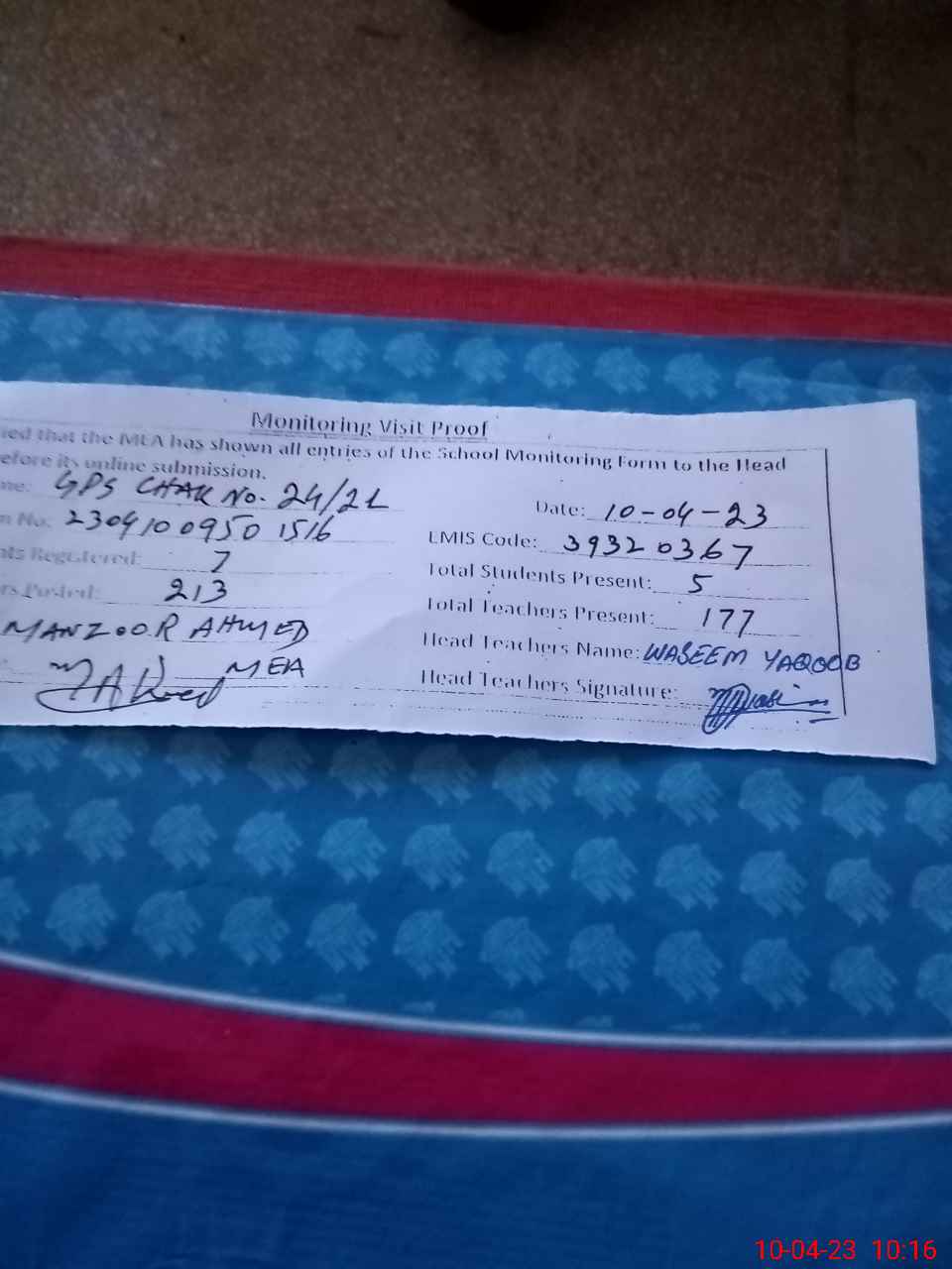 | Attendance Register | Head Teacher | MEA with School | Visit Proof |
