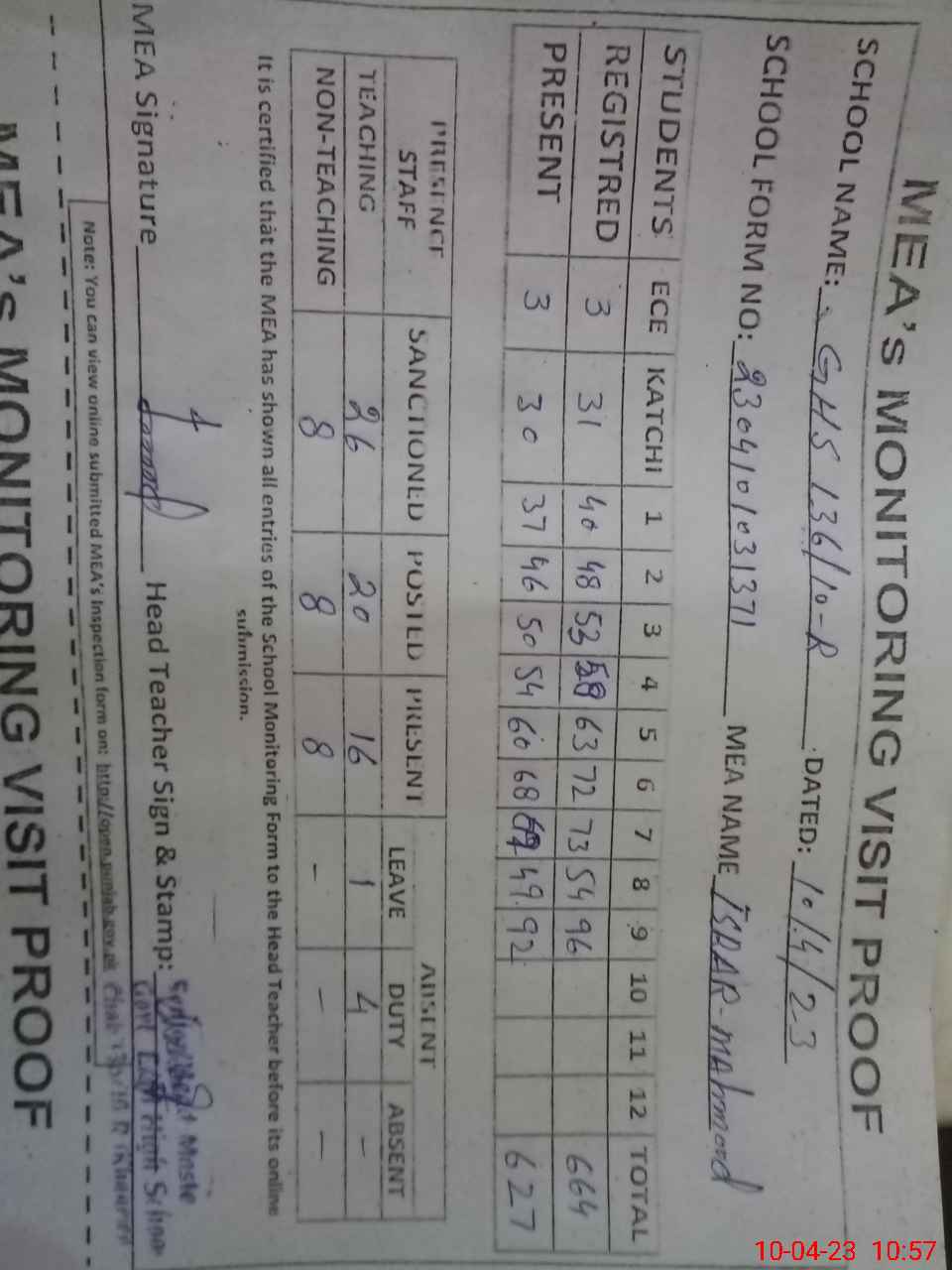 | Attendance Register | Head Teacher | MEA with School | Visit Proof |