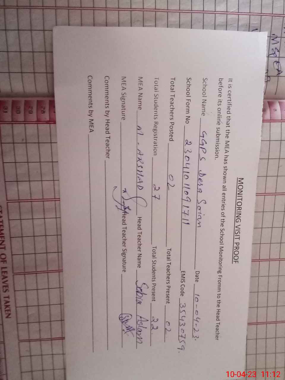 | Attendance Register | Head Teacher | MEA with School | Visit Proof |