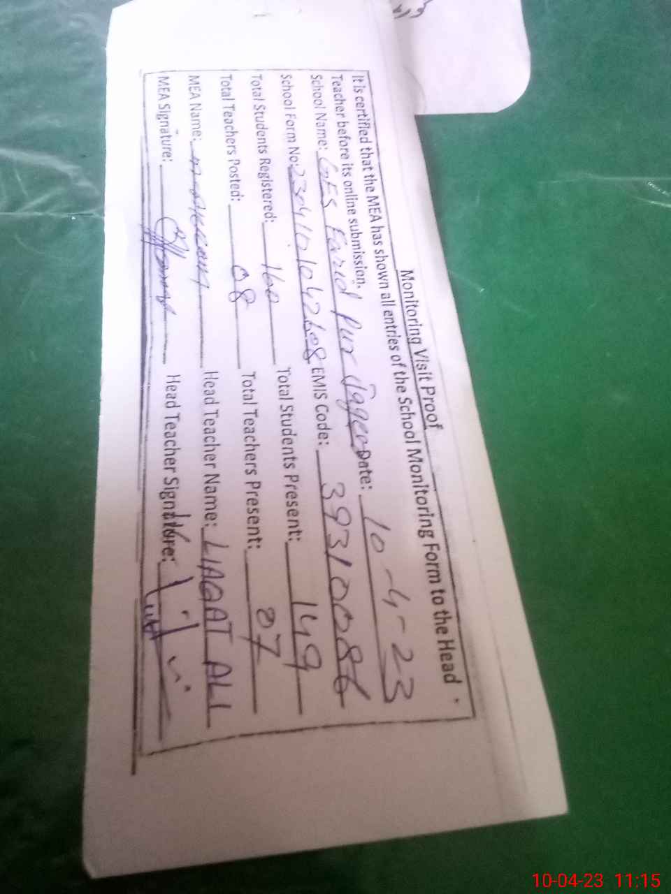 | Attendance Register | Head Teacher | MEA with School | Visit Proof |