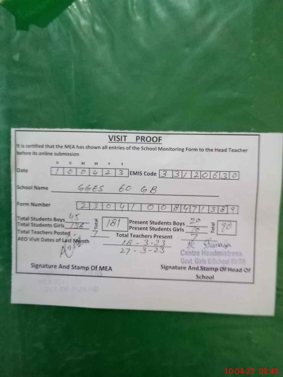 | Attendance Register | Head Teacher | MEA with School | Visit Proof |