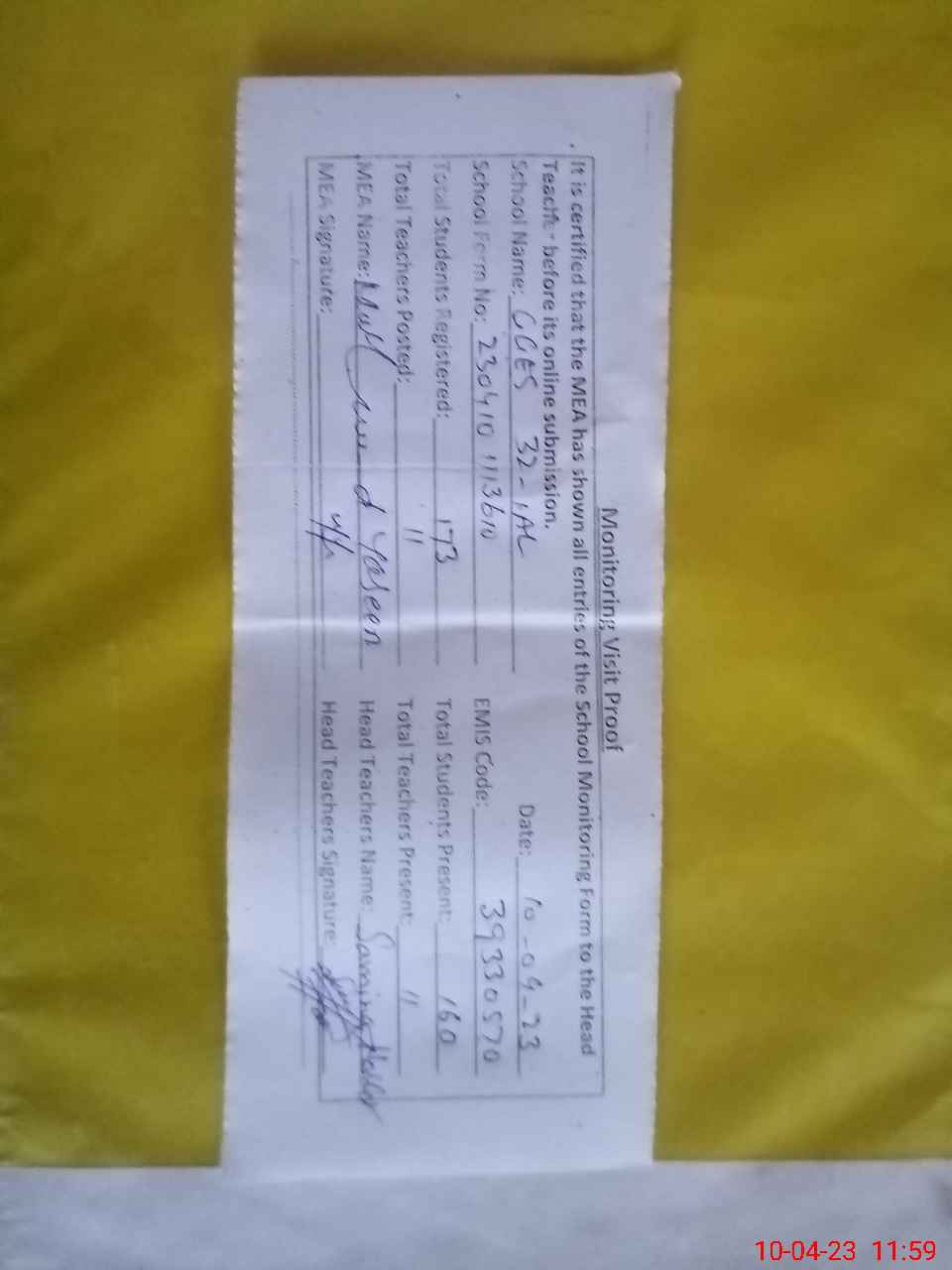 | Attendance Register | Head Teacher | MEA with School | Visit Proof |
