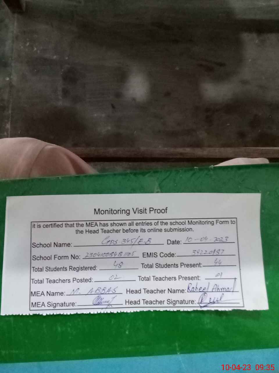 | Certified that this School was Inspected by the Undersigned MEA/DMO Today and the Information Stated Above is as Per Record. | |||||