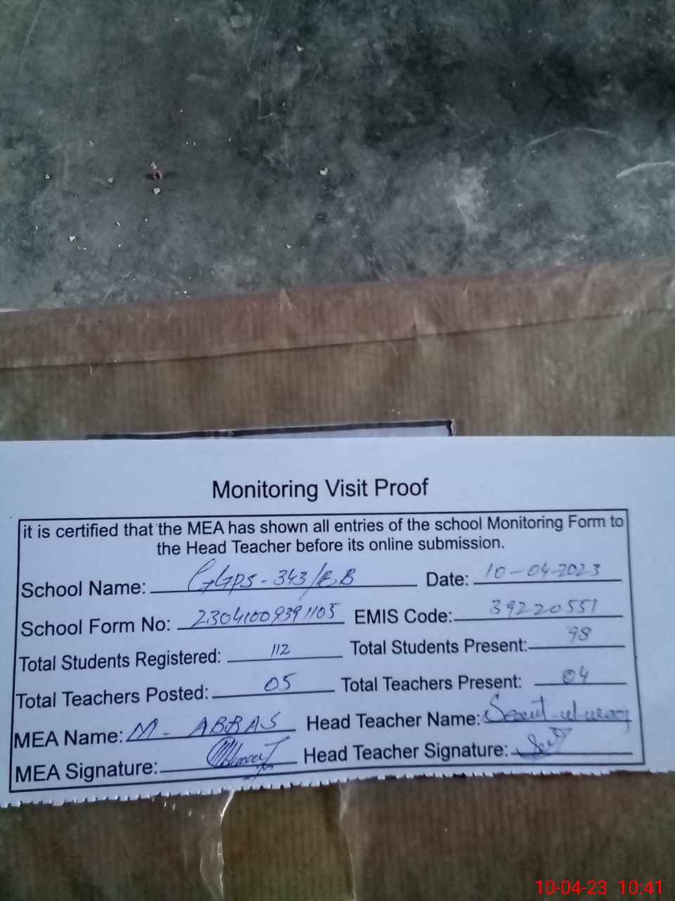 | Attendance Register | Head Teacher | MEA with School | Visit Proof |