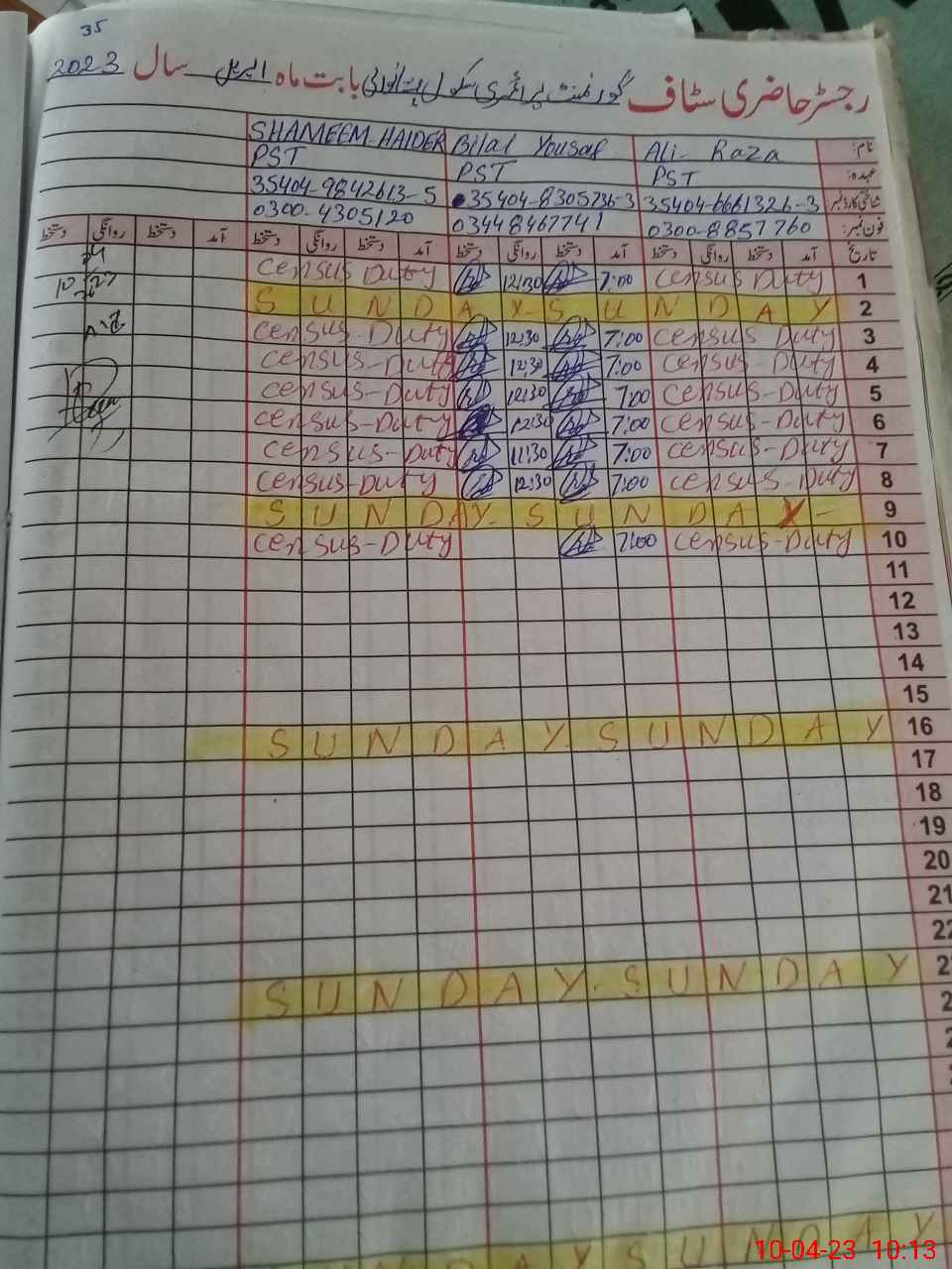 | CNIC | Full Name | Designation | R/C | Absence During Last Calender Month |