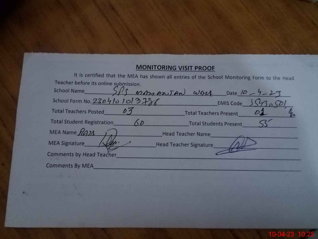 | Attendance Register | Head Teacher | MEA with School | Visit Proof |