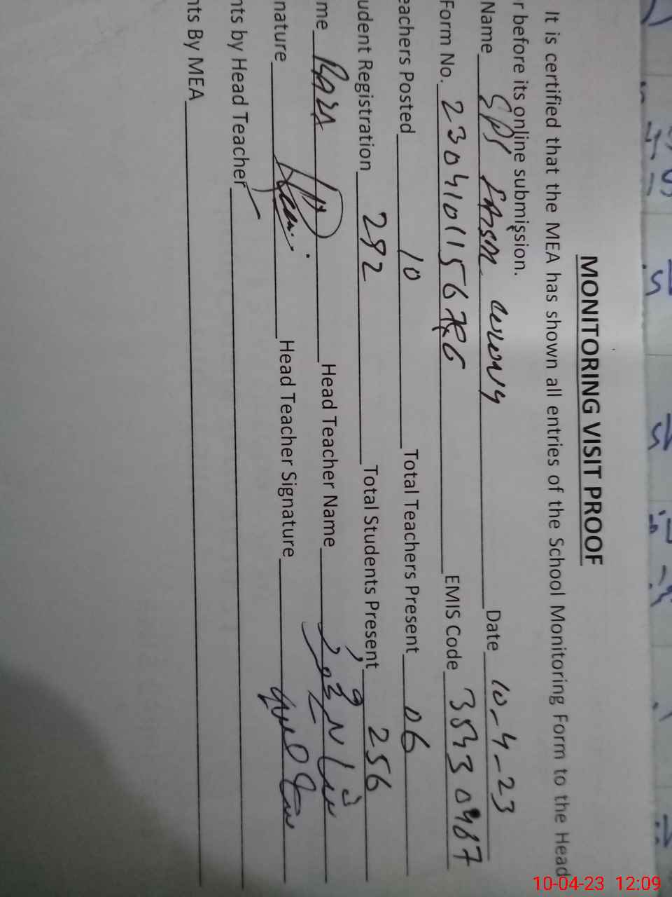| Name: SH**** ME**** Designation: (School Headmaster's/Headmistress's) PST Phone/Cell Number: 03**** |