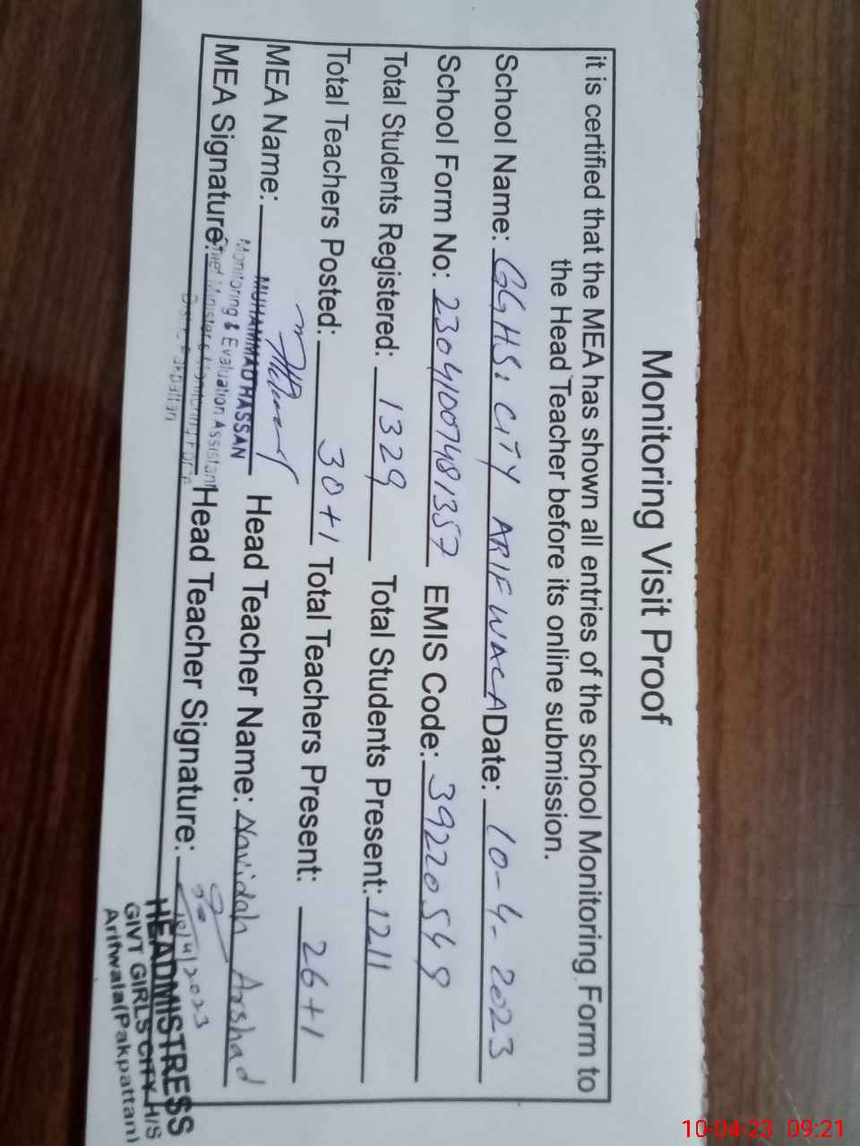 | EMIS Code: 39220549 | Name of School: GGHS CITY ARIFWALA | |||